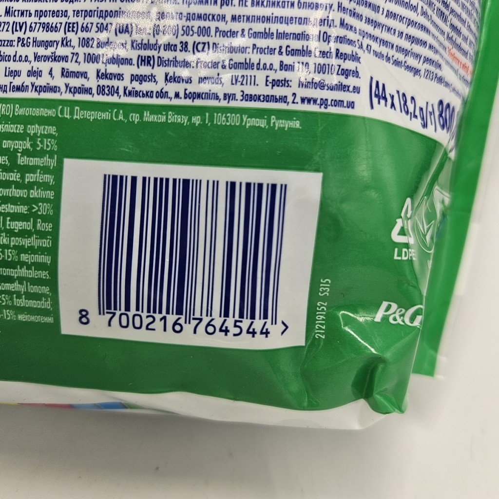 • Skład: >30% Anionowe Środki Powierzchniowo Czynne, 5-15% Niejonowe Środki Powierzchniowo Czynne, Mydło, < 5% Fosfoniany, Enzymy, Rozjaśniacze Optyczne, Perfumy, Alpha-Isomethyl Ionone, Citronellol, Eugenol, Rose Ketones, Tetramethyl Acetyloctahydronaphthalenes