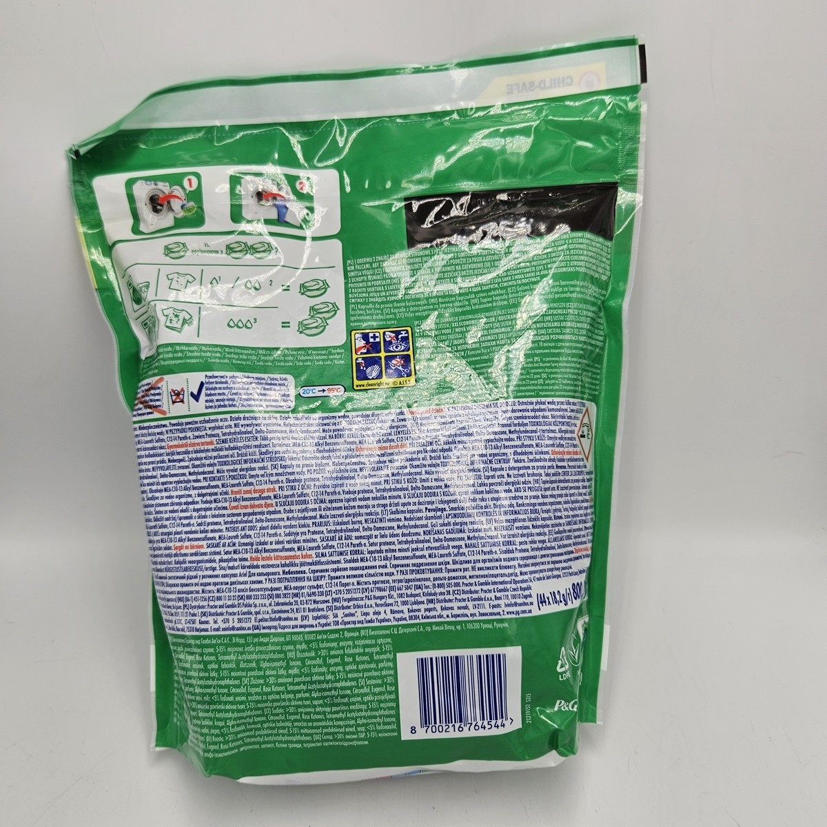 • Uwaga: Powoduje poważne uszkodzenie oczu. Działa drażniąco na skórę. Działa szkodliwie na organizmy wodne, powodując długotrwałe skutki. Przechowywać poza zasięgiem dzieci. W PRZYPADKU DOSTANIA SIĘ DO OCZU: Ostrożnie płukać wodą przez kilka minut. W PRZYPADKU KONTAKTU ZE SKÓRĄ: Umyć dużą ilością wody. W PRZYPADKU POŁKNIĘCIA: Wypłukać usta. NIE wywoływać wymiotów. Zawiera MEA-C10-13 Alkyl Benzenesulfonate, MEA-Laureth Sulfate, C12-14 Pareth-n. Zawiera Protease, Tetrahydrolinalool, Delta-Damascone, Methylundecanal. Może powodować reakcję alergiczną.