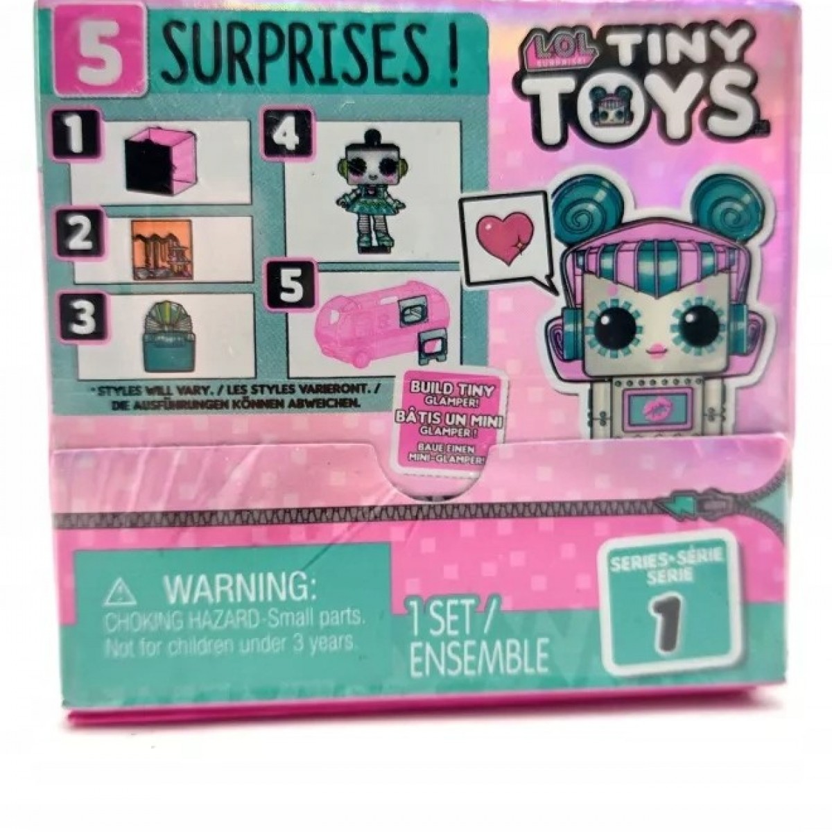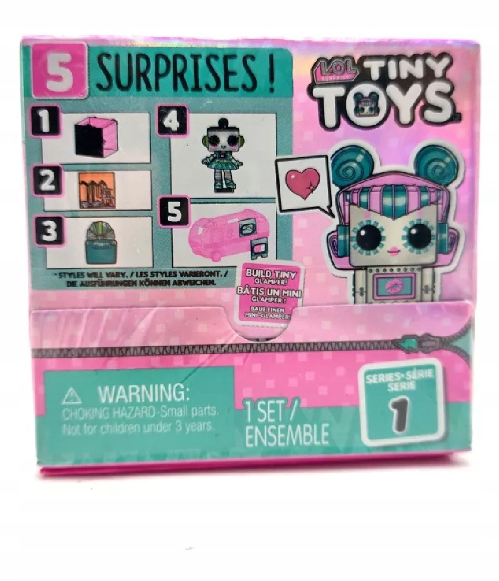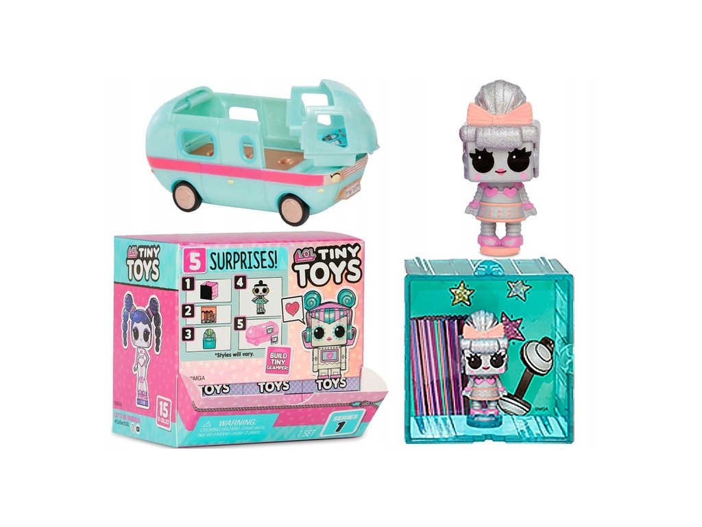 Tiny Toys to nowa seria sygnowana popularną na całym świecie marką L.O.L. Surprise. Każde pudełeczko zawiera mini laleczkę-robota wraz z pięcioma akcesoriami, w tym jeden element miniaturowego kampera do samodzielnego zbudowania (pozostałe elementy znajdziesz w innych pudełeczkach) Każda laleczka ma zdejmowane włoski, które można również wymieniać z innymi laleczkami. Zabawka obudowana jest w specjalną kostkę, którą można łączyć z innymi kostkami, tworząc niesamowite konstrukcje, które jednocześnie mogą posłużyć jako gablota kolekcjonerska.