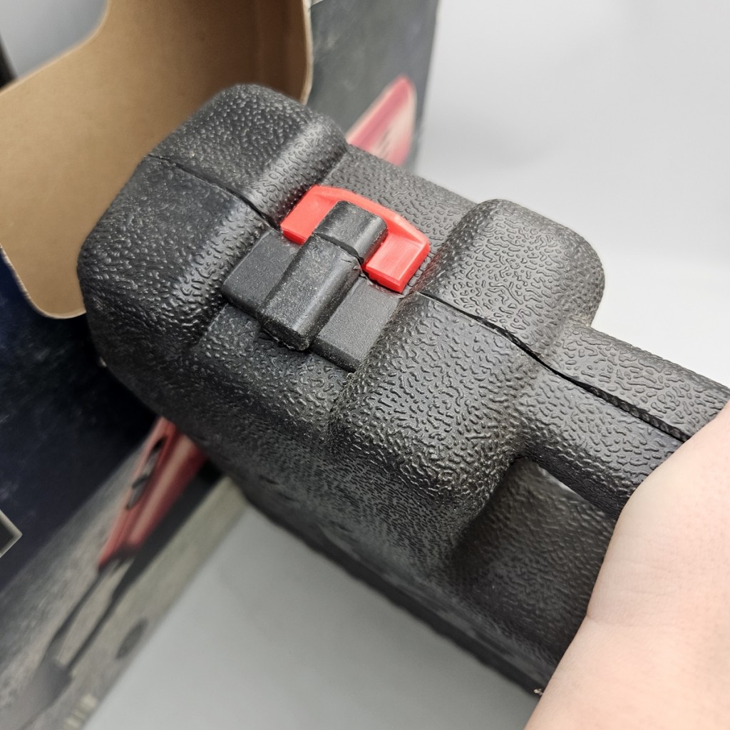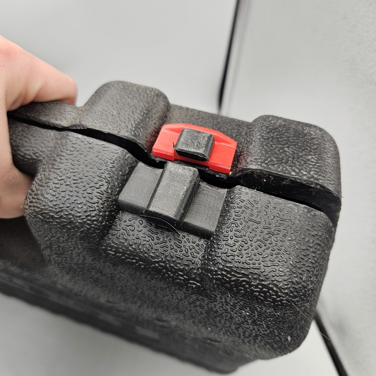 Uszkodzona walizka przy zapięciu.